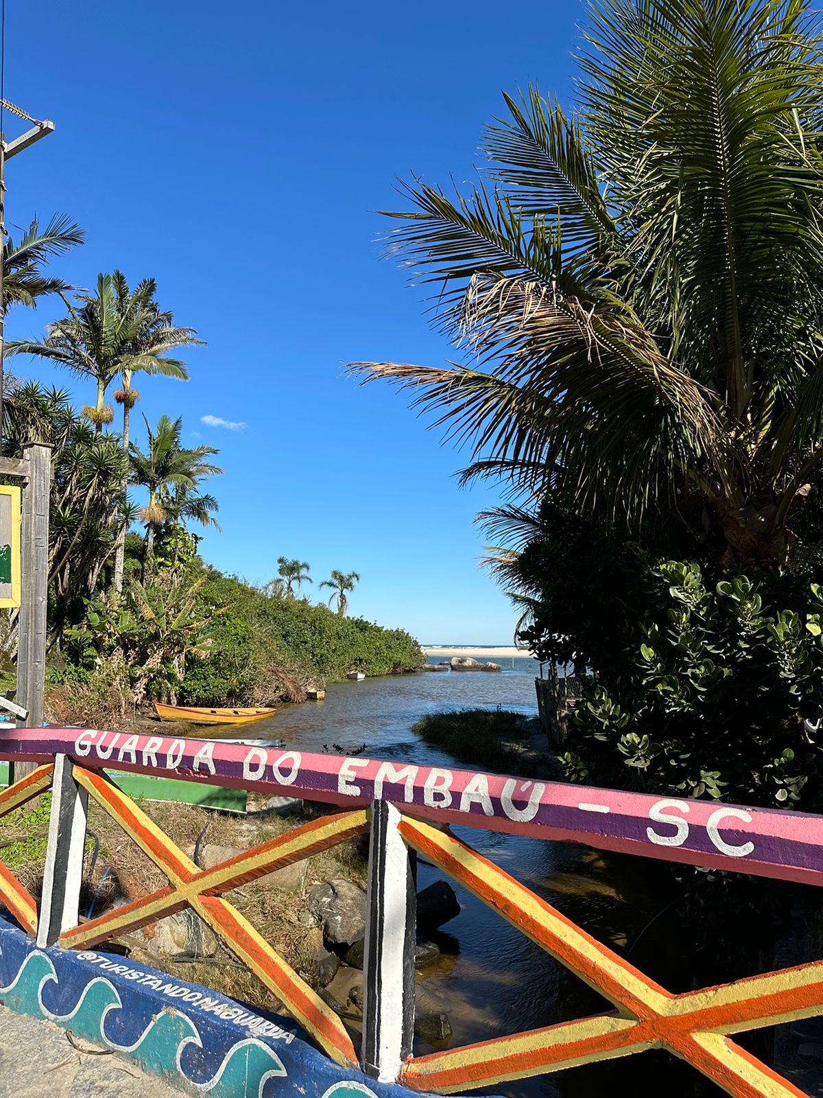 Ubicada a pocos minutos de Palhoça, Guarda do Embaú es famosa por su mezcla perfecta de mar, río y morros, creando uno de los paisajes más lindos del sur de Brasil. Para llegar a la playa, cruzamos el río da Madre, ya sea en bote o caminando por la arena cuando la marea lo permite. ¡Es una experiencia distinta y súper divertida!